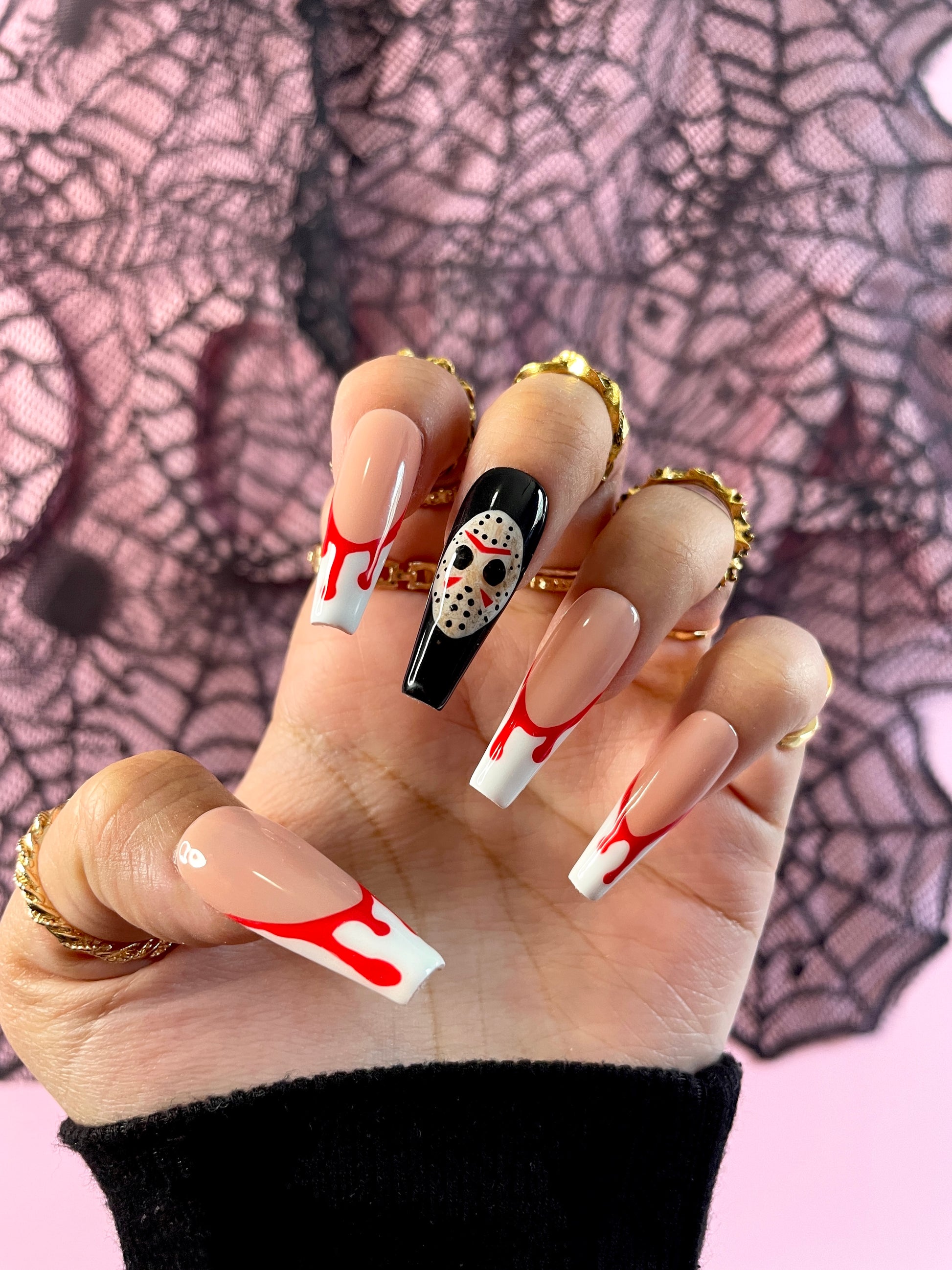 Introducing 13th by anclaws.com . Our luxury press on nails are perfect for Halloween or any special occasion. Our Halloween nail designs feature classic Friday the 13th symbols, perfect for the spooky season. Get your nails ready for any event with 13th by andclaws!