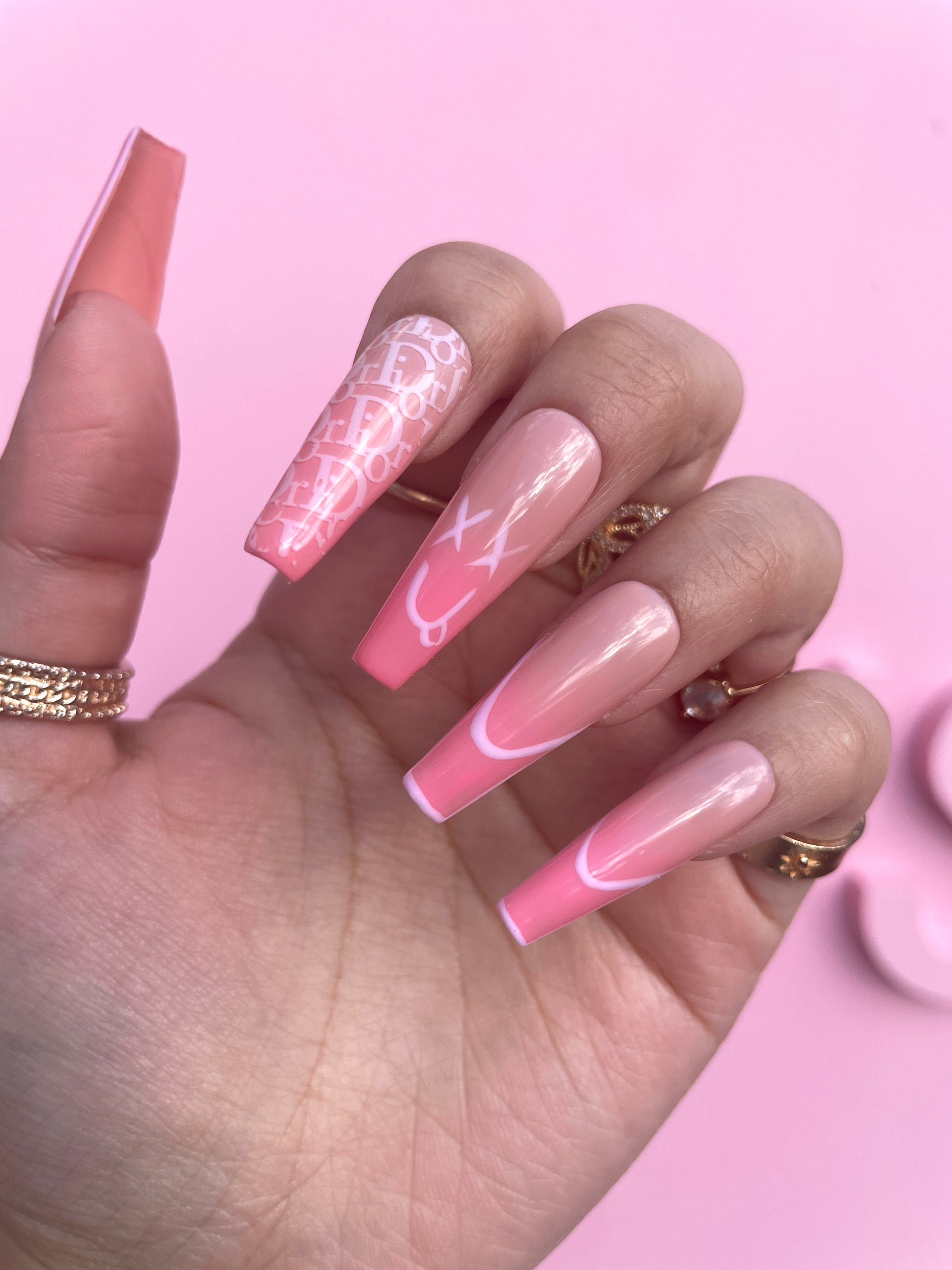 Glossy or matte nude background with pink ombre & french tip designs.