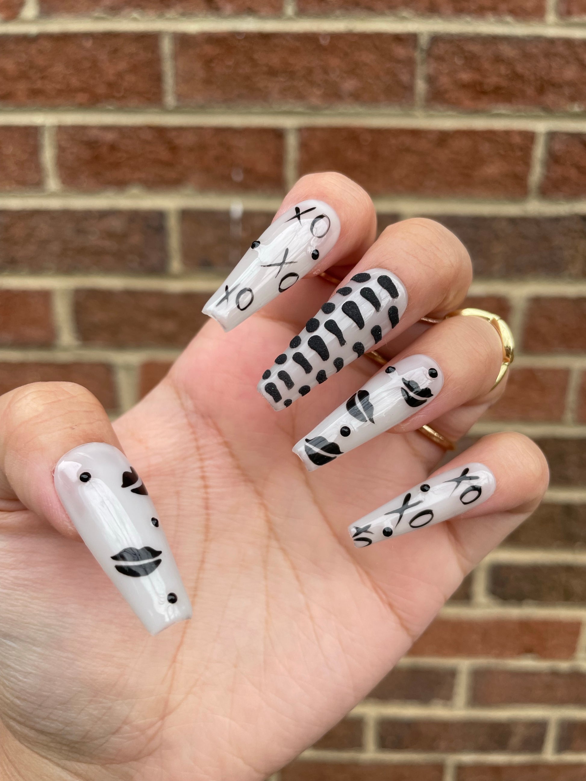 Glossy or matte light grey background with black lip & XO designs. Middle finger has textured 3d snake design.