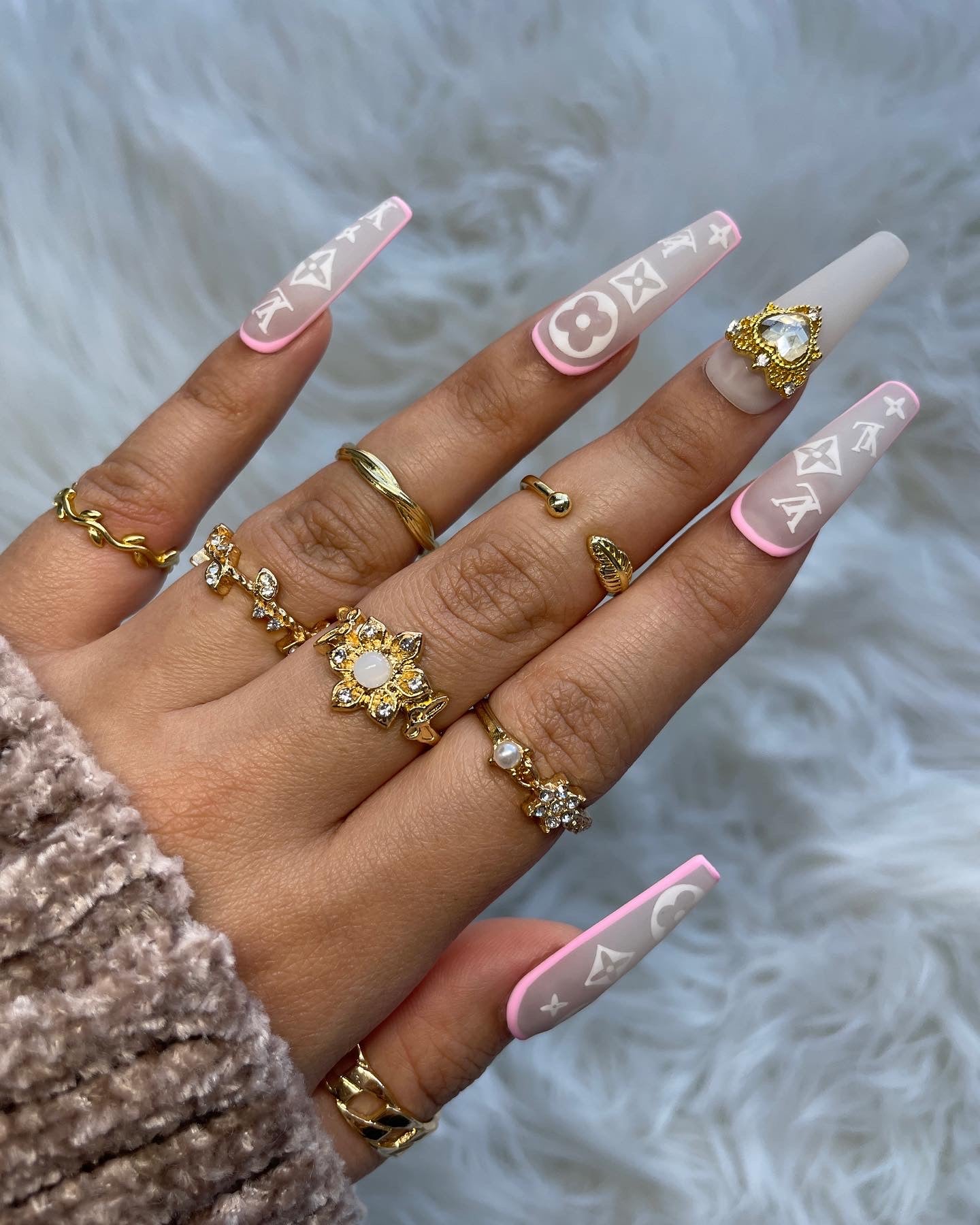 Glossy or matte light grey background with white designer pattern and gold middle finger heart charm