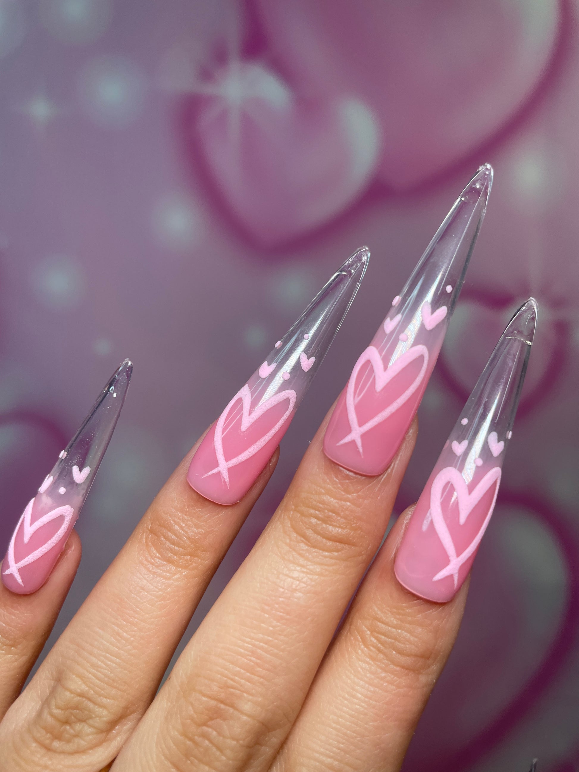 Glossy light pink ombre to clear nails, with 3d heart designs