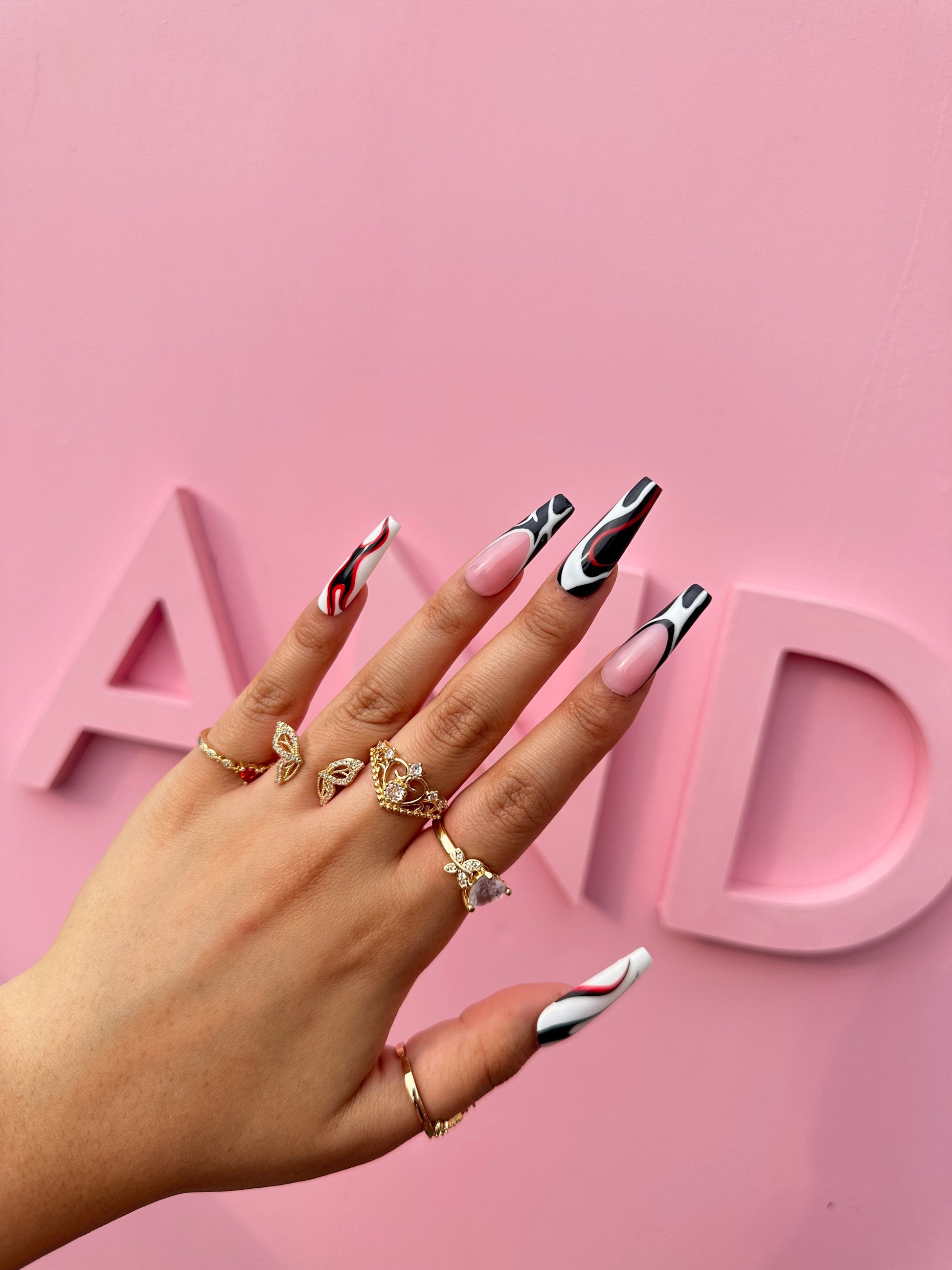 Glossy or matte french tip nails in the colors of white, black, and red with spikey designs.