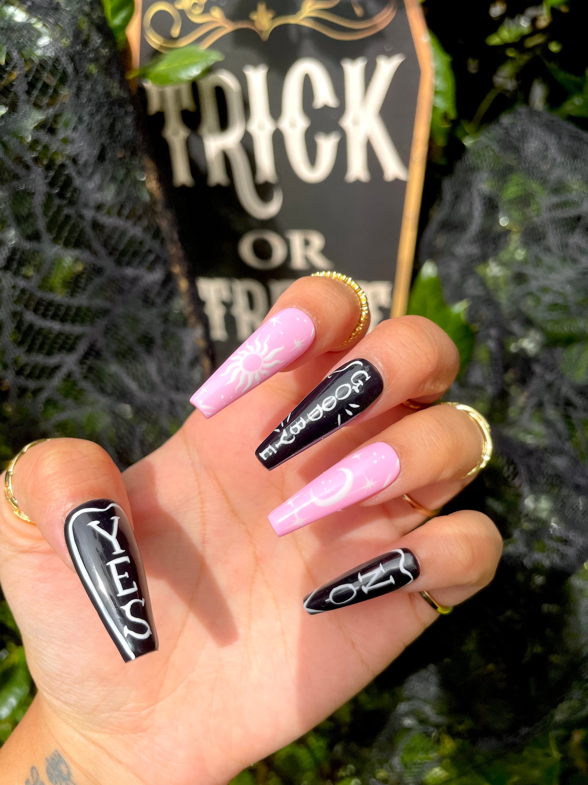 Black and light pink nails with ouija board inspired nails. Available in glossy or matte