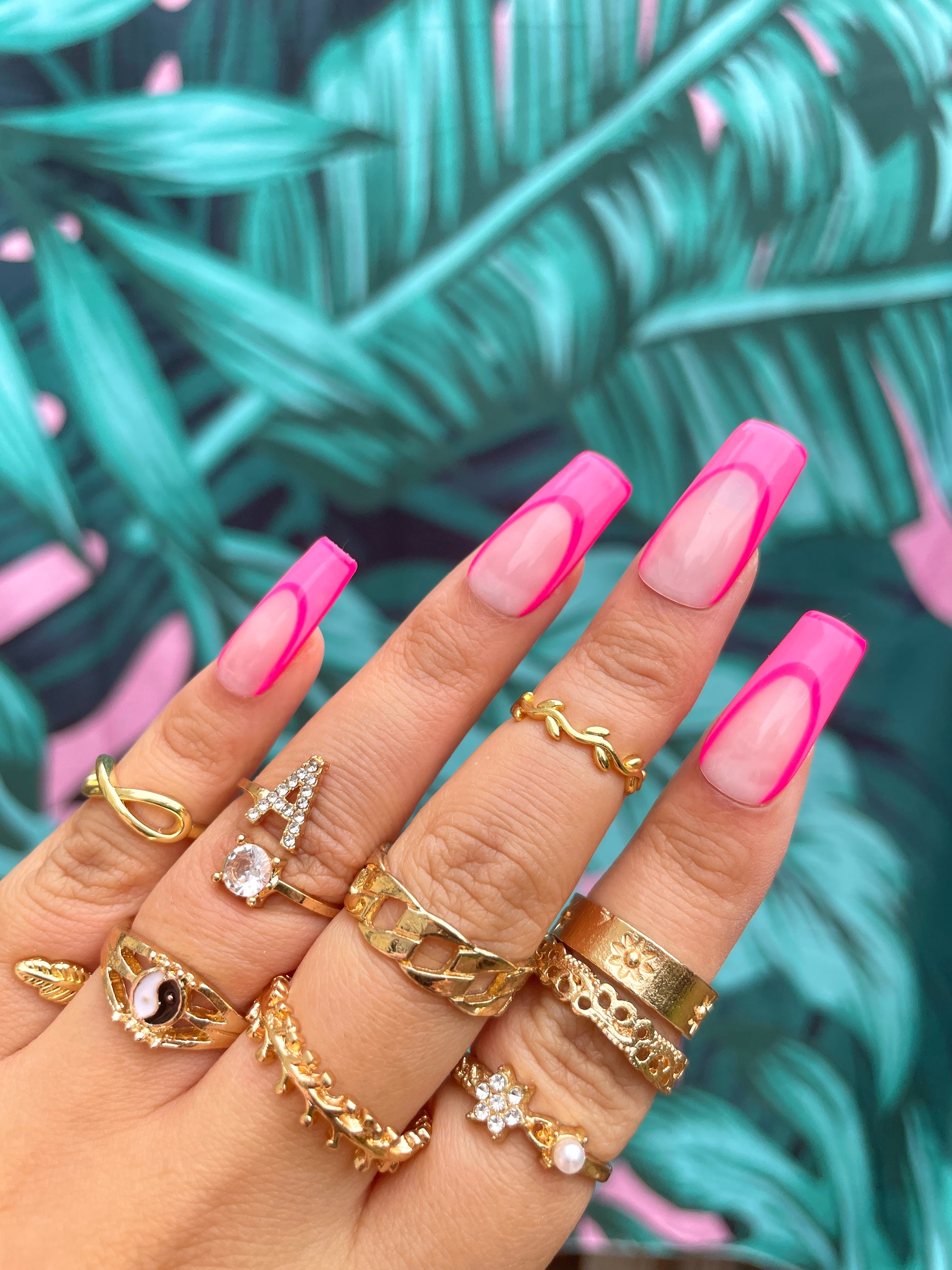 Glossy or matte light purple background with pink and dark pink french tip designs.
