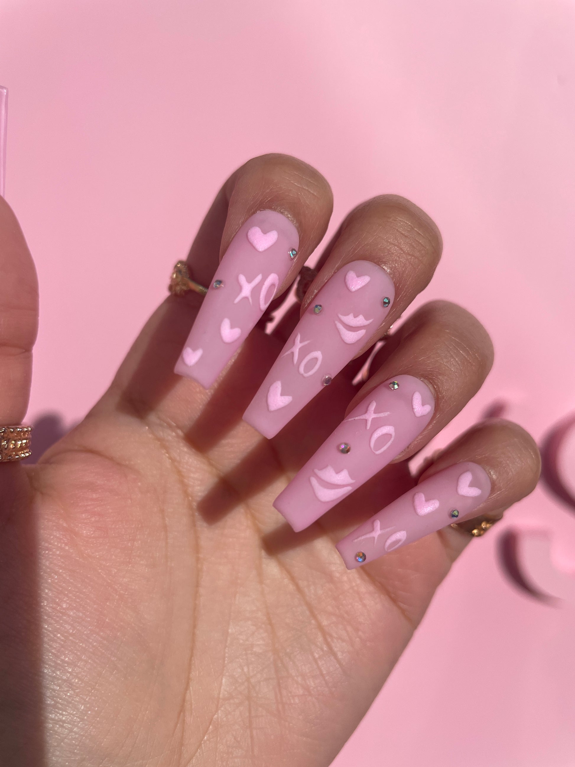 "Elevate your style with Serenade press-on nails – the epitome of luxury and charm. Our glamour pink nails, adorned with adorable hearts and the sweet message 'x o,' will captivate your heart. Experience elegance and playfulness in one stunning package. Discover the beauty of luxury press-on nails today!"