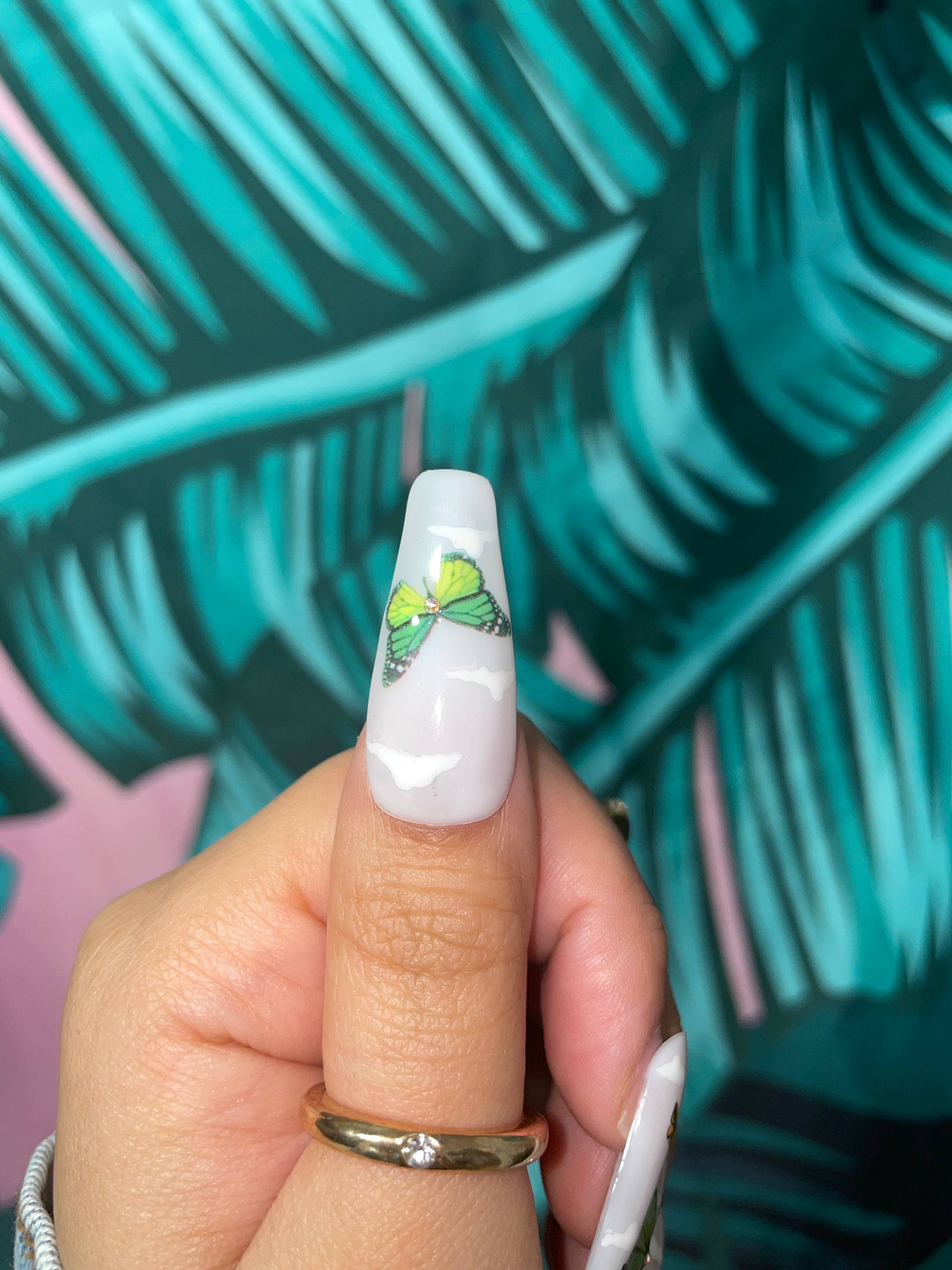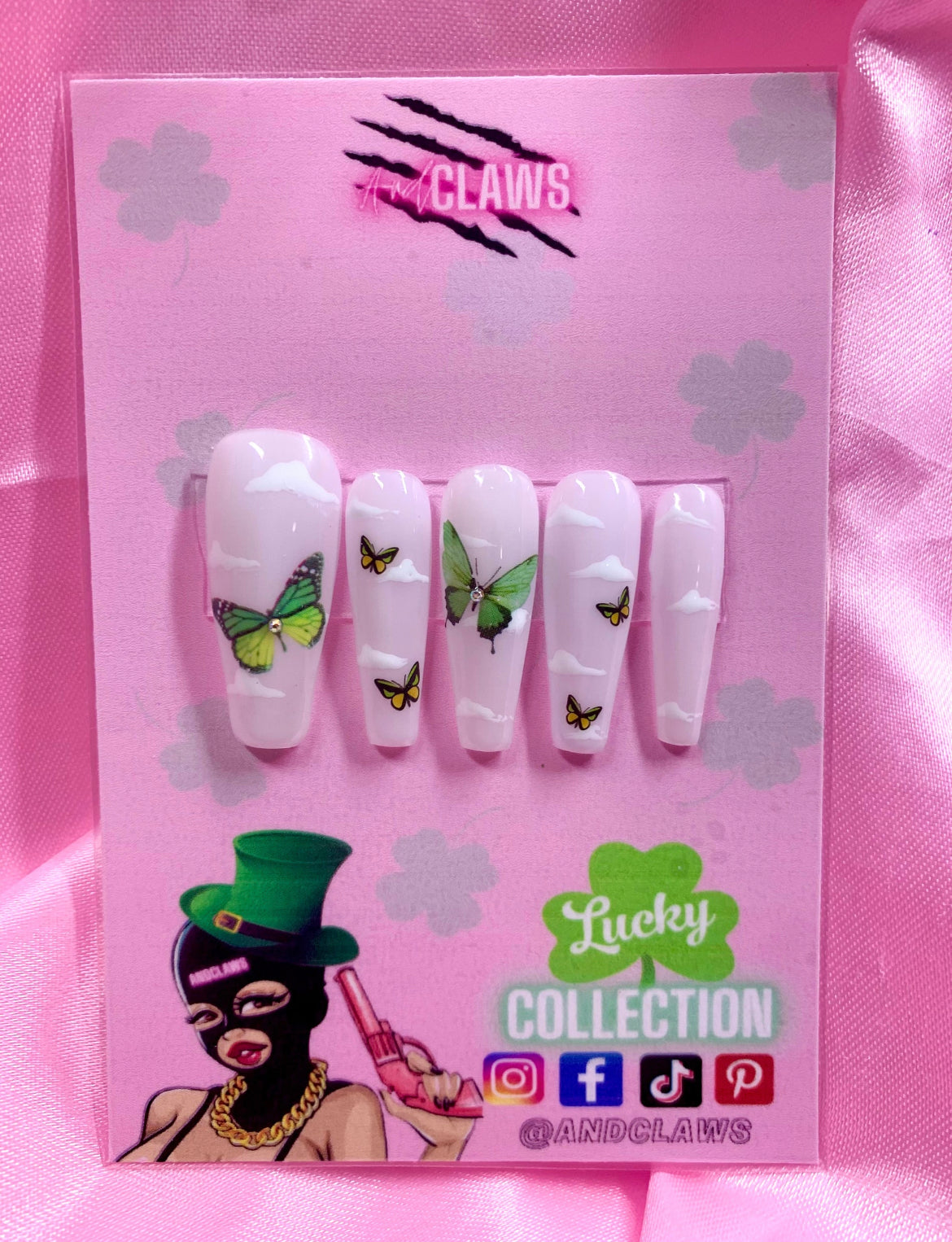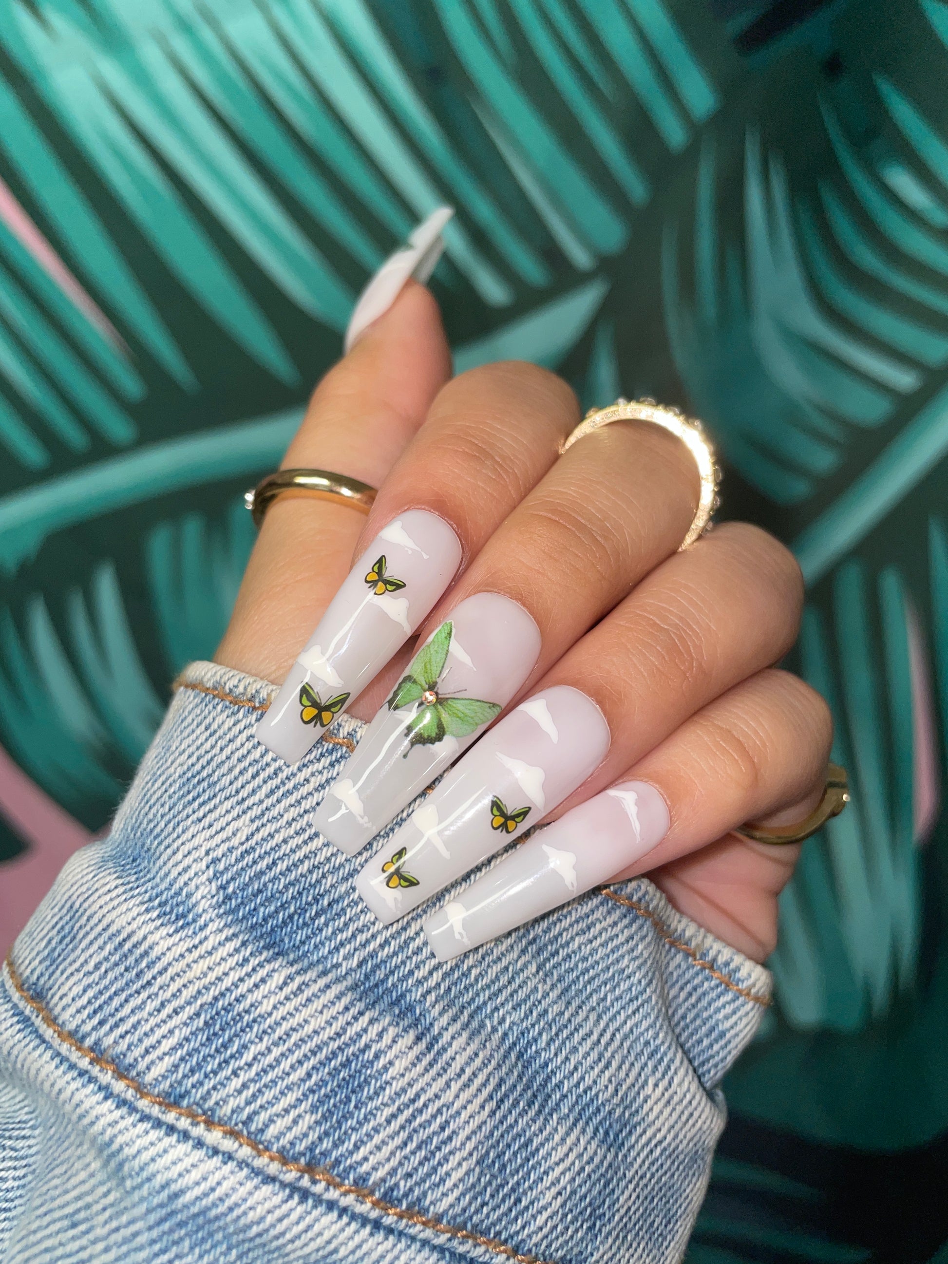 Milky white background with bright white cloud designs. Green butterfly designs cover the nails with a glossy finish.