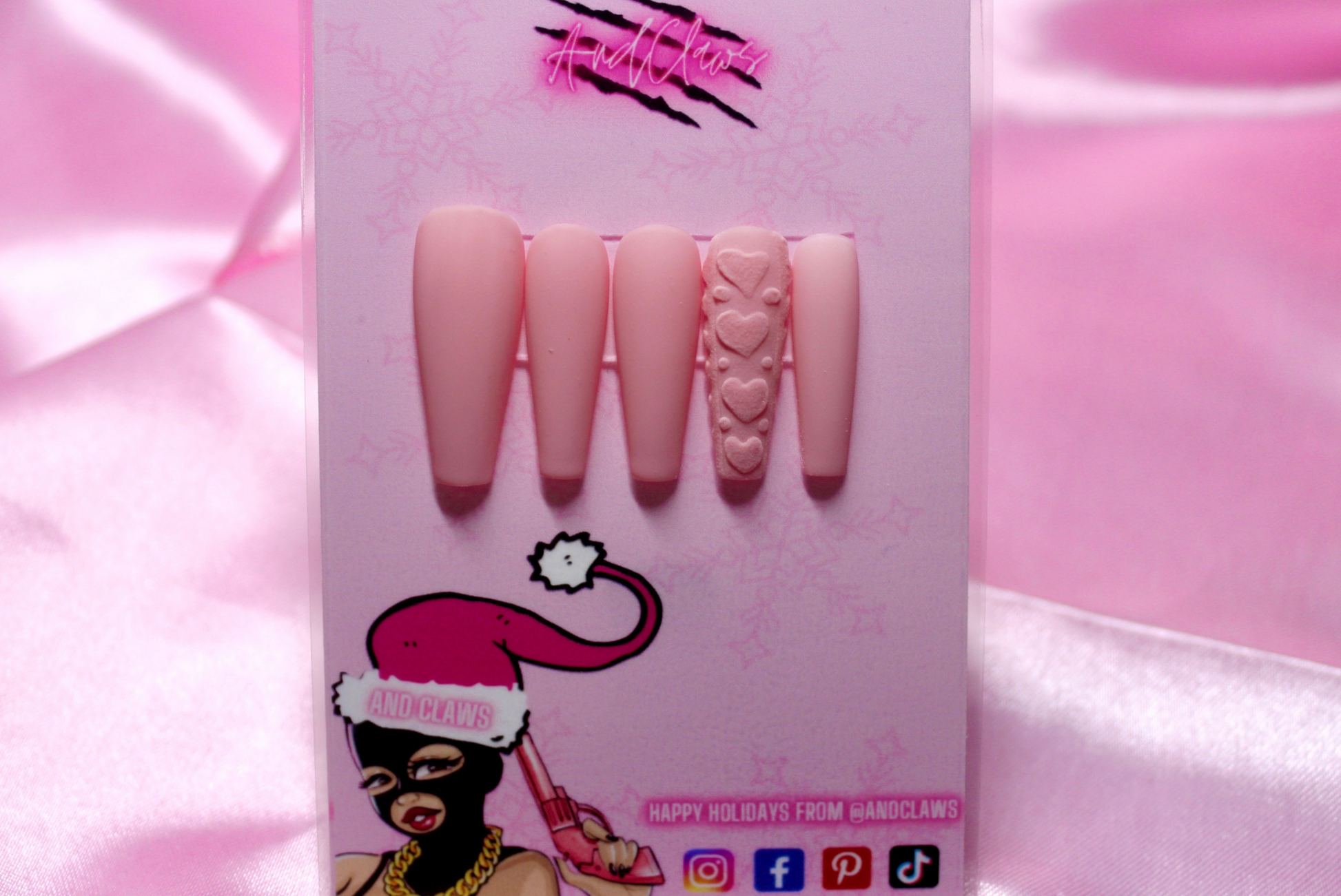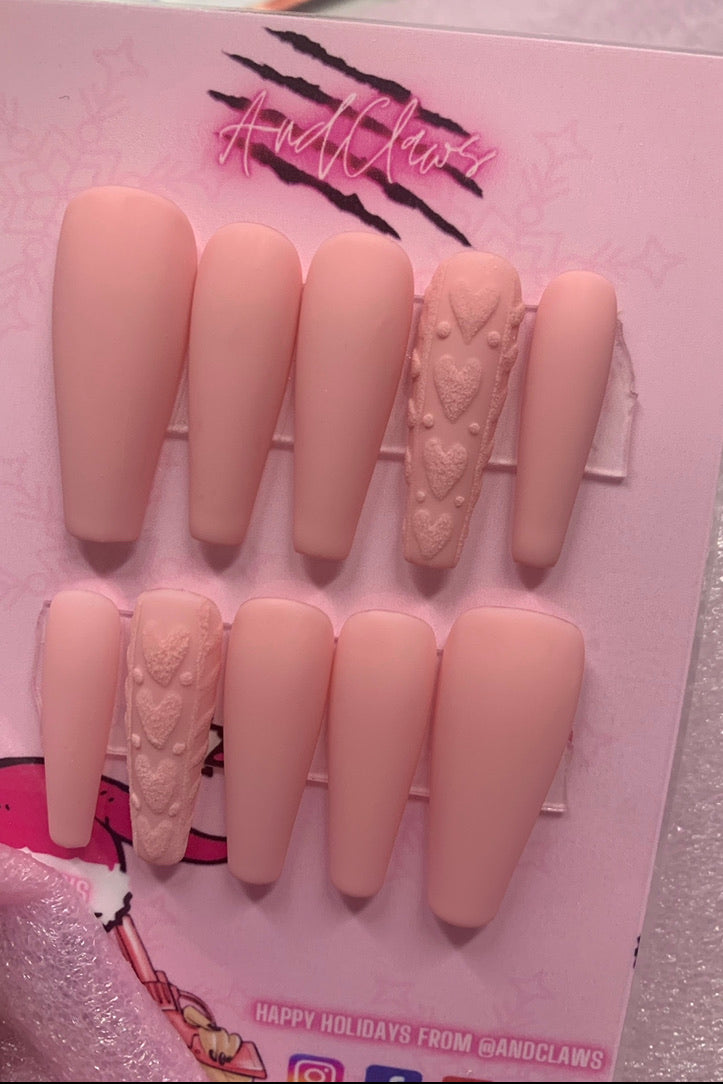 Blush Pink Matte Nails with Heart Sweater Design on Ring Finger