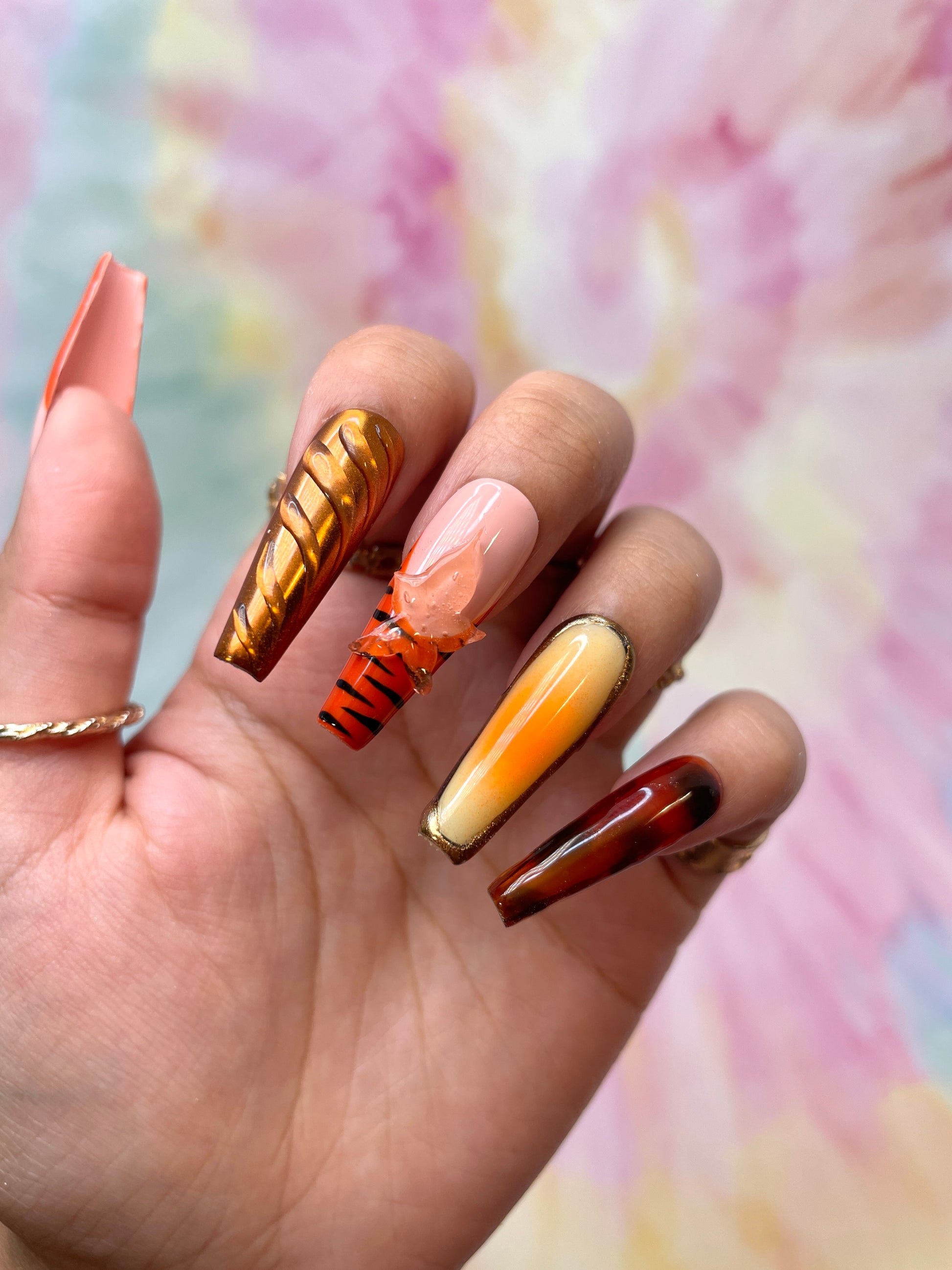 Glossy golden yellow/orange nails with 3d effect designs