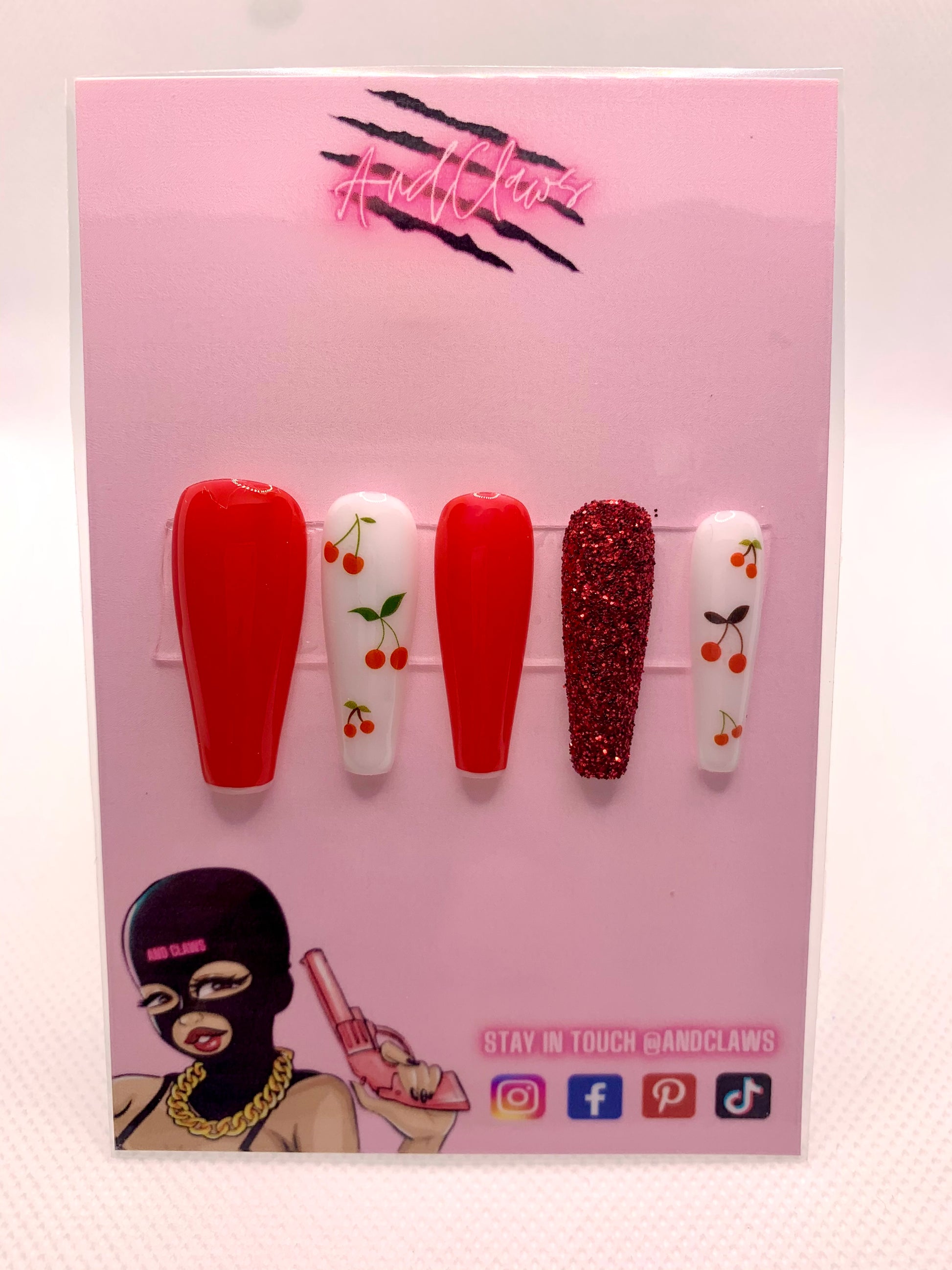 Cherry red color on Thumb & Middle fingers with white tips. Bright white pointer & pinky fingers with cherry designs. Red raw glitter Ring finger.