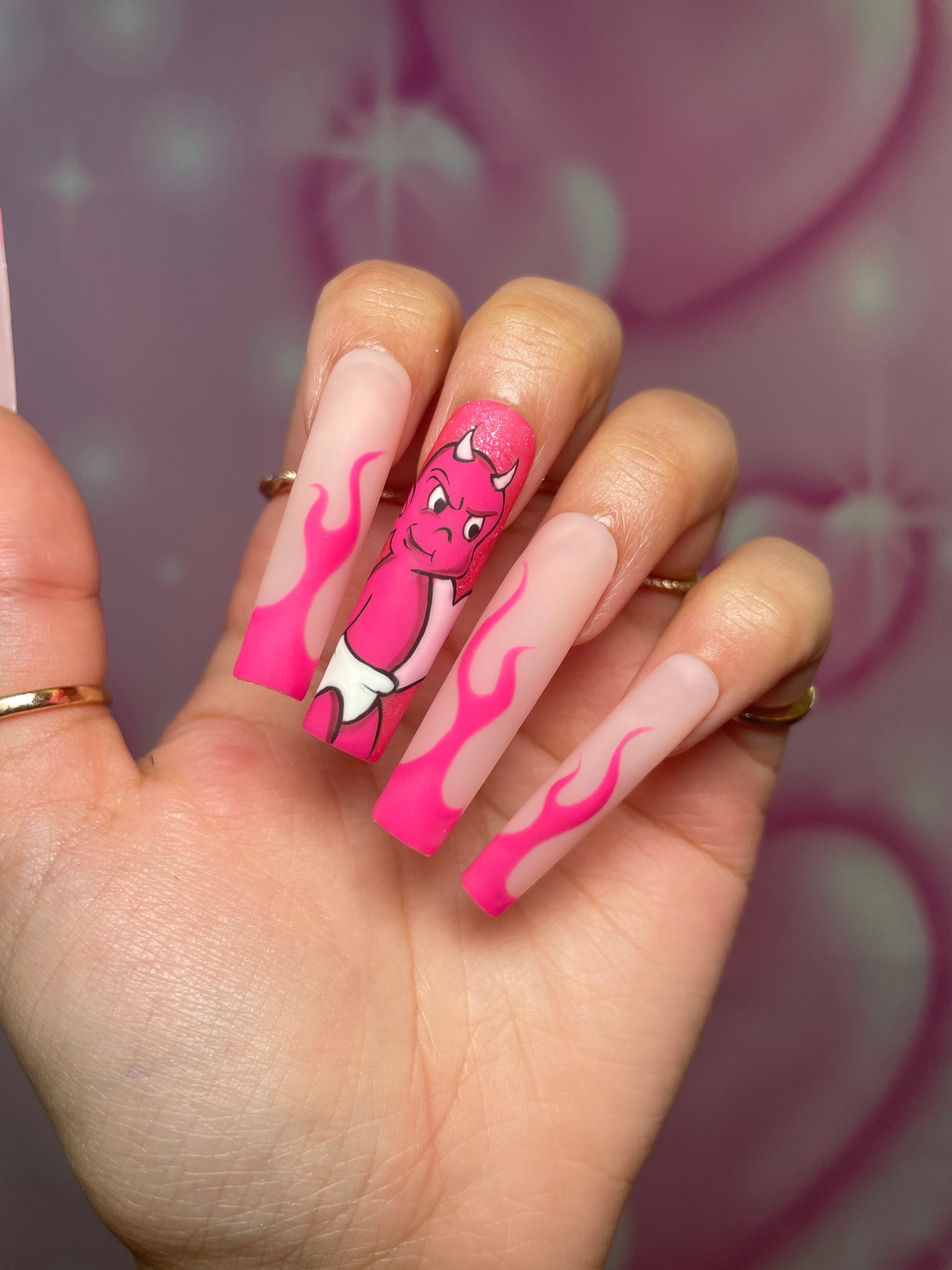 Light nude background with hand-painted cartoon devil baby and flame design on one hand.