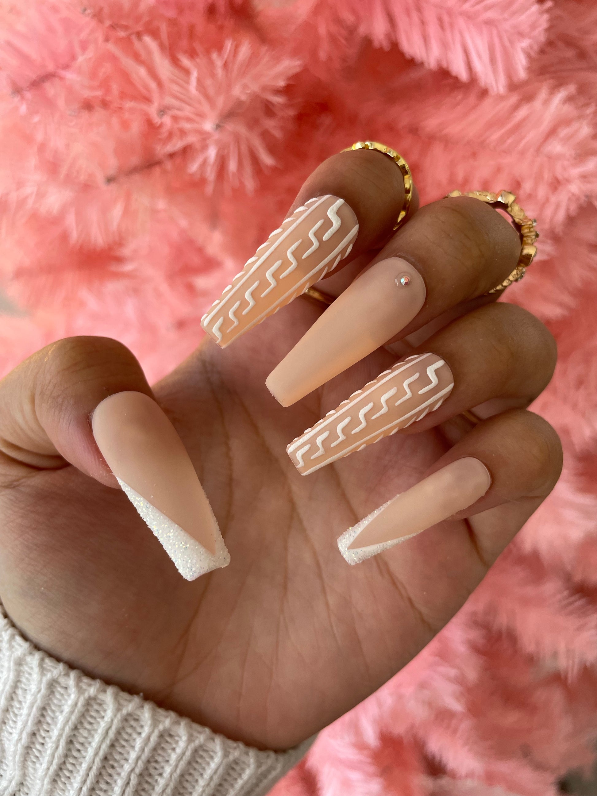 Matte pale nude with glitter french tip thumb and pinky. 3d sweater design on pointer and ring fingers.