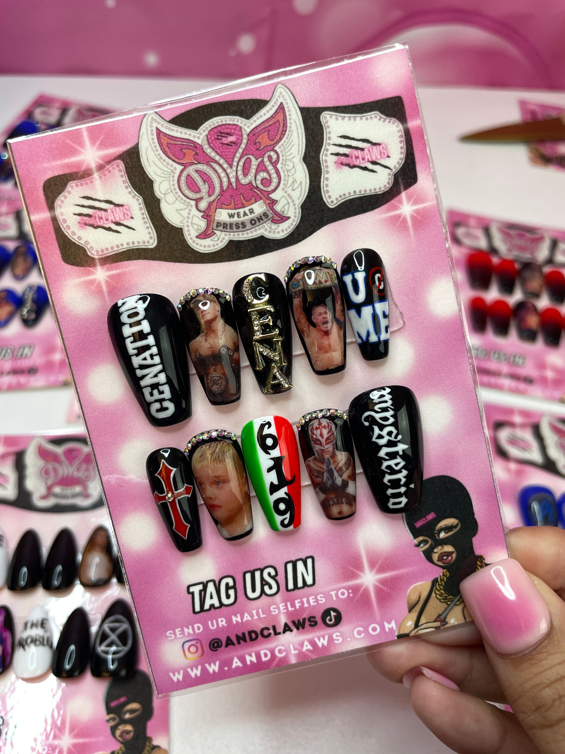 VIRAL glossy black nails with multiple handpainted designs.