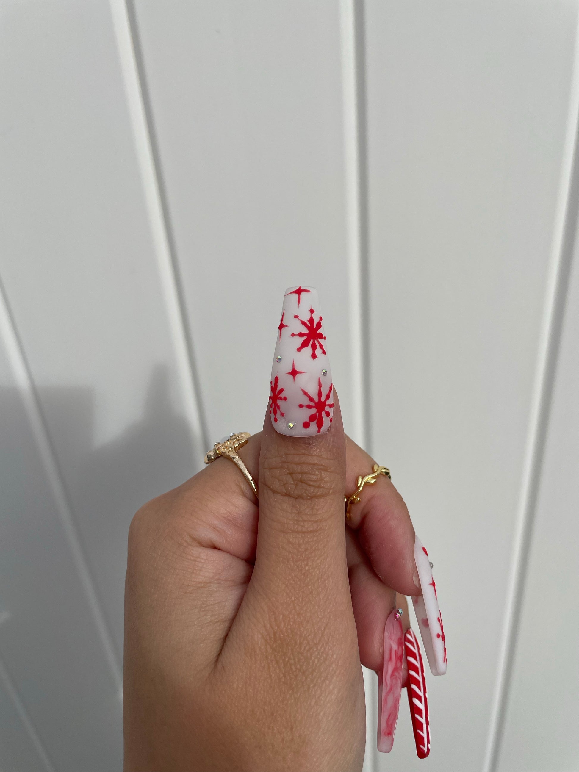 Matte milky white nails with red snowflakes and heart sweater design. Red marble nails with white prada design. Gems spread out on nails.