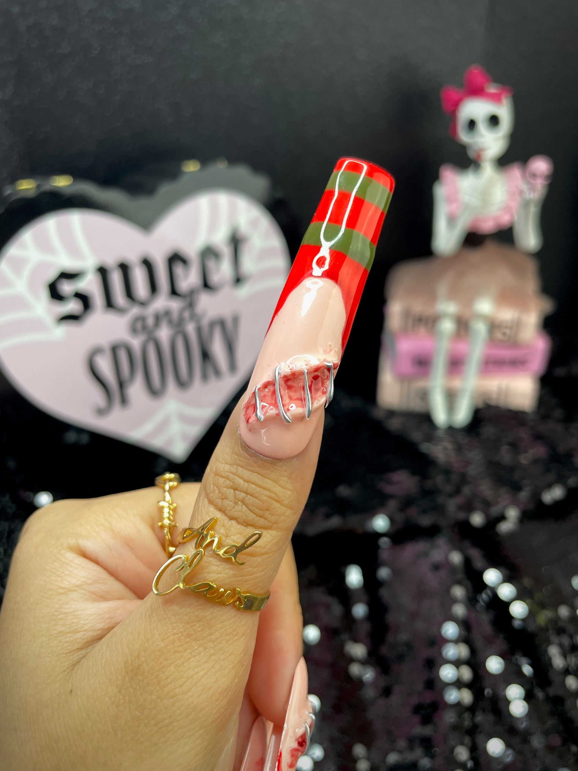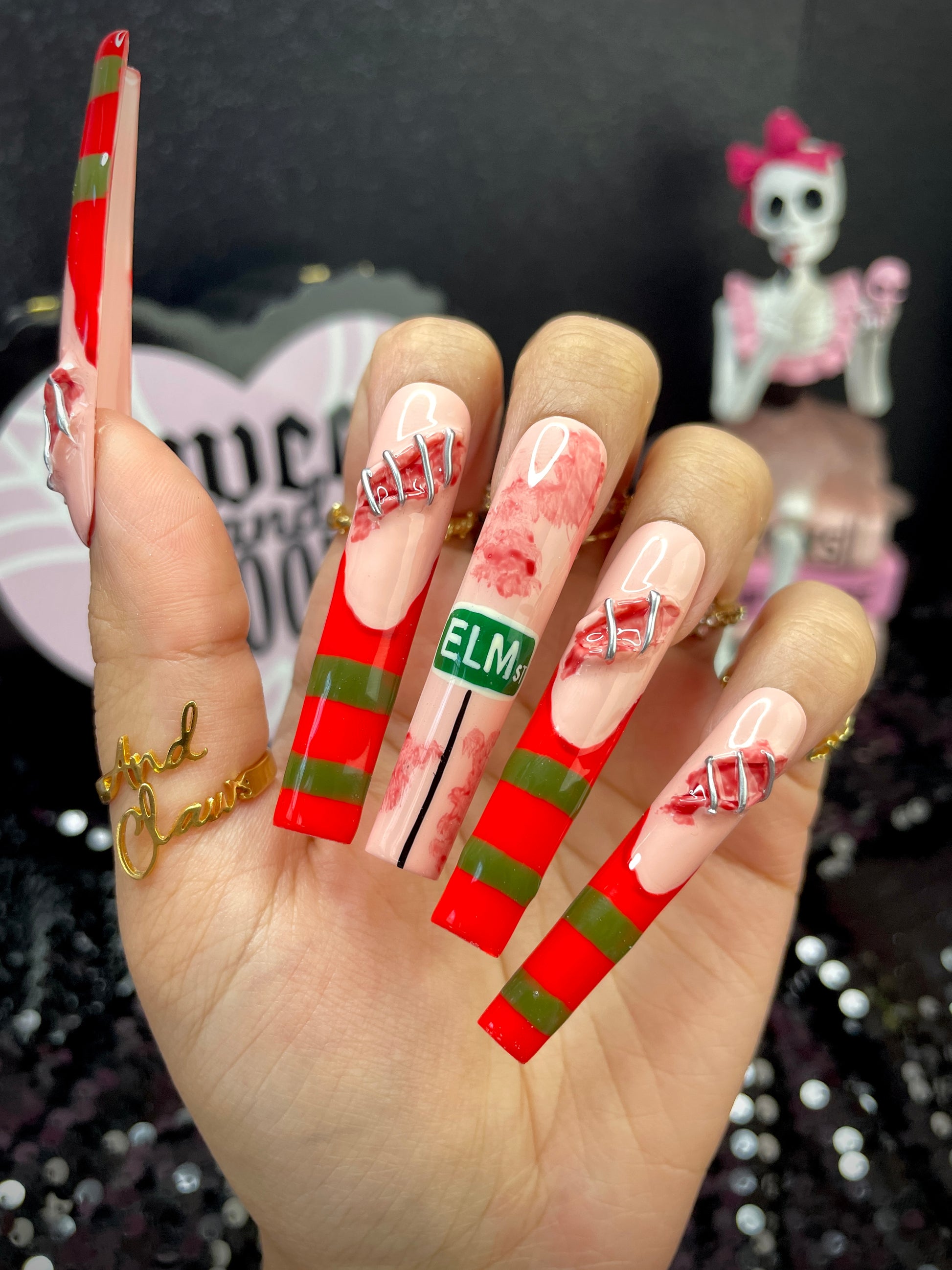 Shiny striped French tips are paired with a street sign design and detailed 3D stitch accents for a sophisticated look.