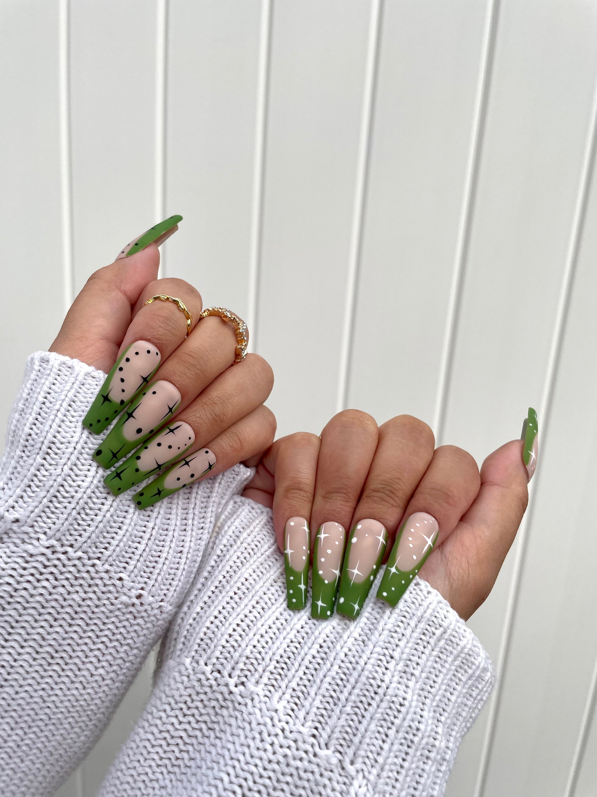 Matte or Glossy green french tip with black and white sparkle designs