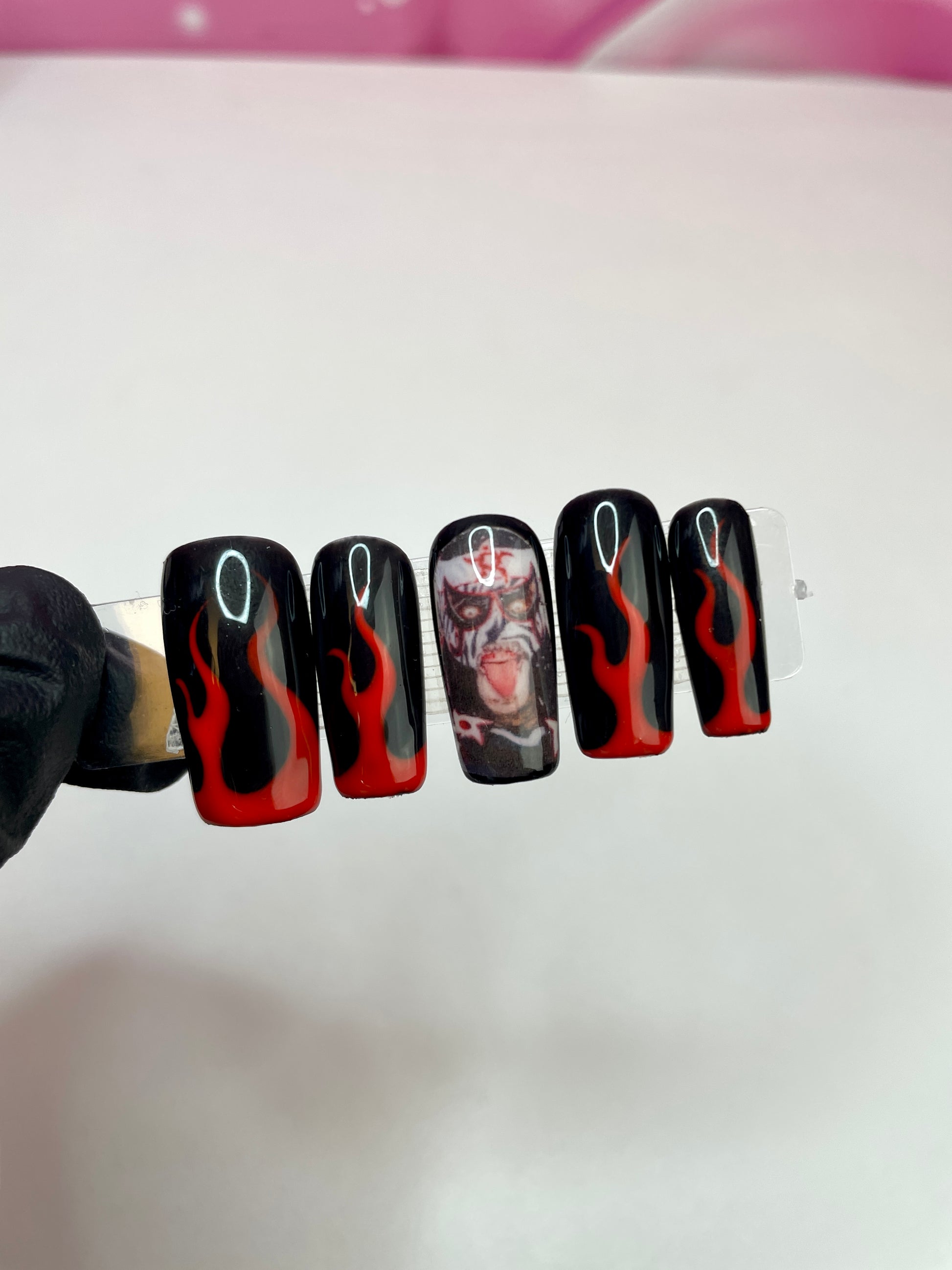 Glossy black nails with red flames